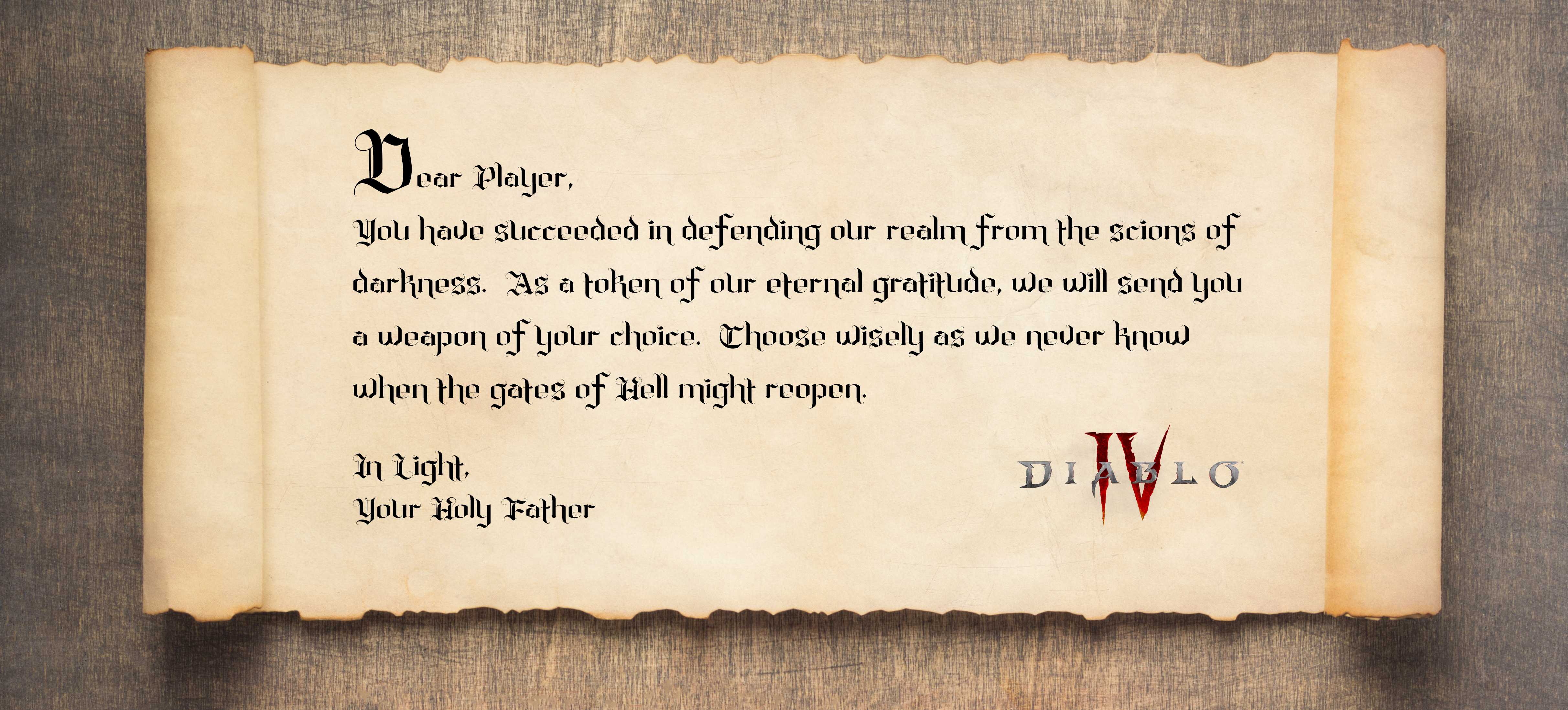 Along with the thank you players will be sent a real life replica of their weapon of choice from their time playing Diablo IV to show off on their streams